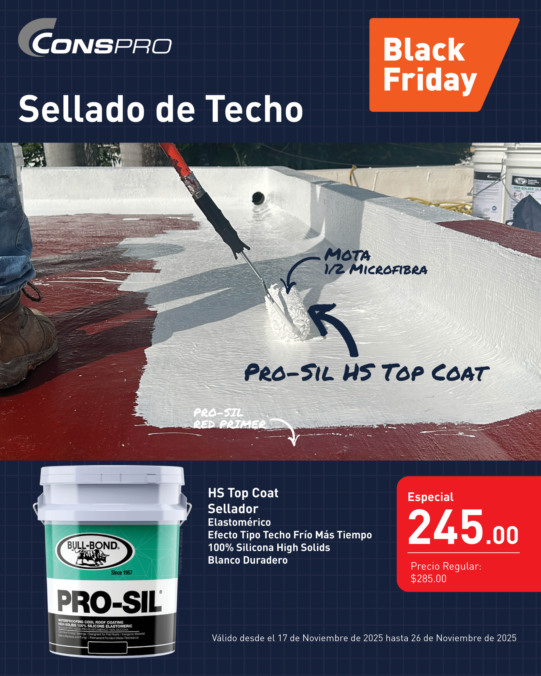 Pro-Sil® HS es un sellador elastomérico tipo techo-frío, 100% silicona, alto en contenido de sólidos y con un acabado ultra blanco. Formulado para sellar y proteger techos contra el agua y los rayos UV en climas tropicales extremos. Está elaborado a base de silicona pura, lo que lo hace un material inorgánico completamente inerte a las bacterias, hongos y el crecimiento de algas y resistente a las condiciones asociadas con agua estancada. La composición química de lo hace muy resistente al ambiente, 100% hidrofóbico y fácil de lavar.